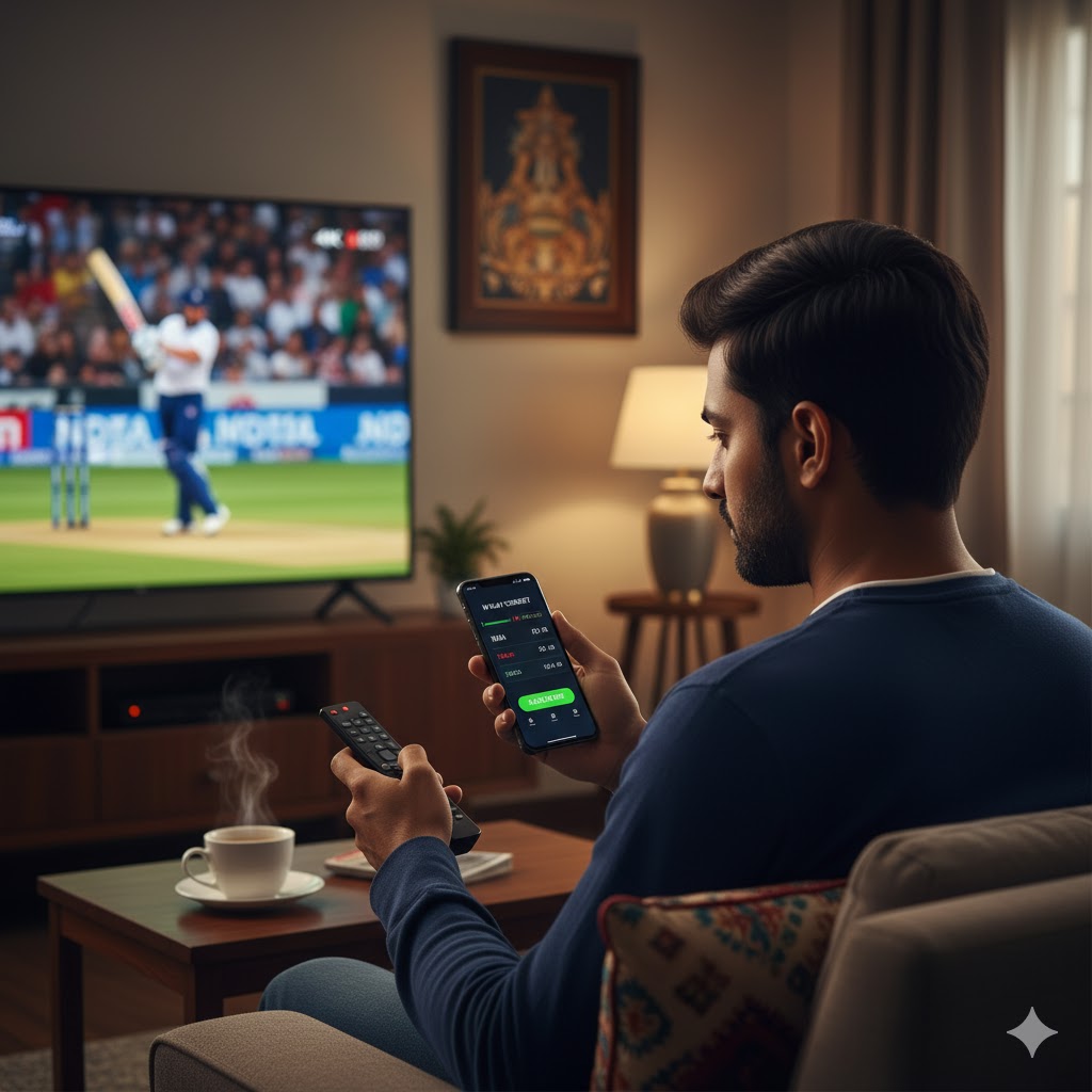 An illustration of someone actively engaging with mobile betting while watching a live match on TV: